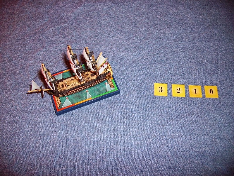 Being marginally upwind of the French - she used the black lettered column on the chart, and rolled a 2 on the D6.