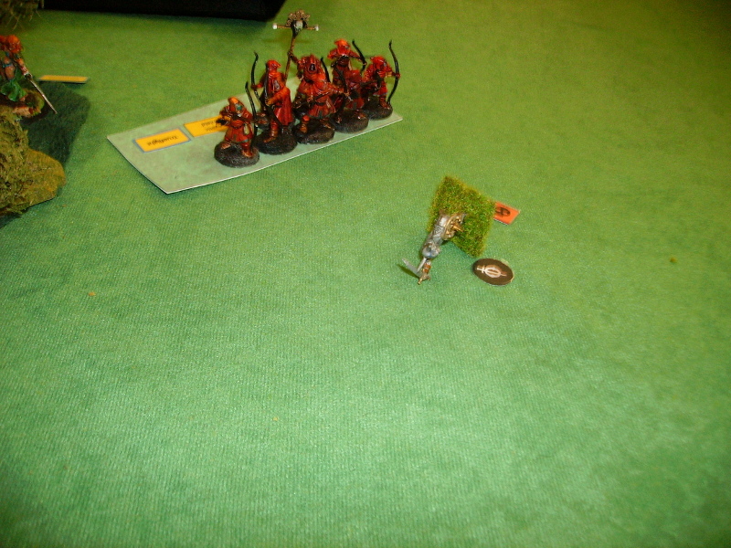 I won the Initative, my General and the last remaining Warrior attacked the shaken elven bowmen and broke them, but my General was now alone!